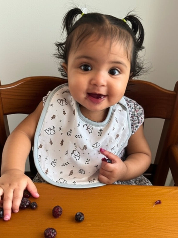 A bib is a protective garment worn primarily by infants and young children during feeding. It has 100% cotton exterior, which provides superior softness and good absorbency. The blend filling enhances the bib's functionality, typically adding a layer of resilience and quicker drying property. It features a wide, often scoop-shaped, front panel that drapes over the child's chest and secures around the neck with Ties and Velcro. Its main purpose is to catch spilled food and dribbled liquids, preventing stains and keeping the child's clothing clean and dry.